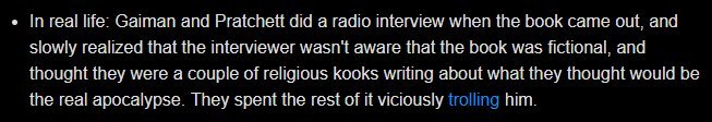 Source: TV Tropes’ Trivia page for Good Omens (Literature). katanaclone December 9, 2018 Published by katanaclone View all posts by katanaclone Published December 9, 2018